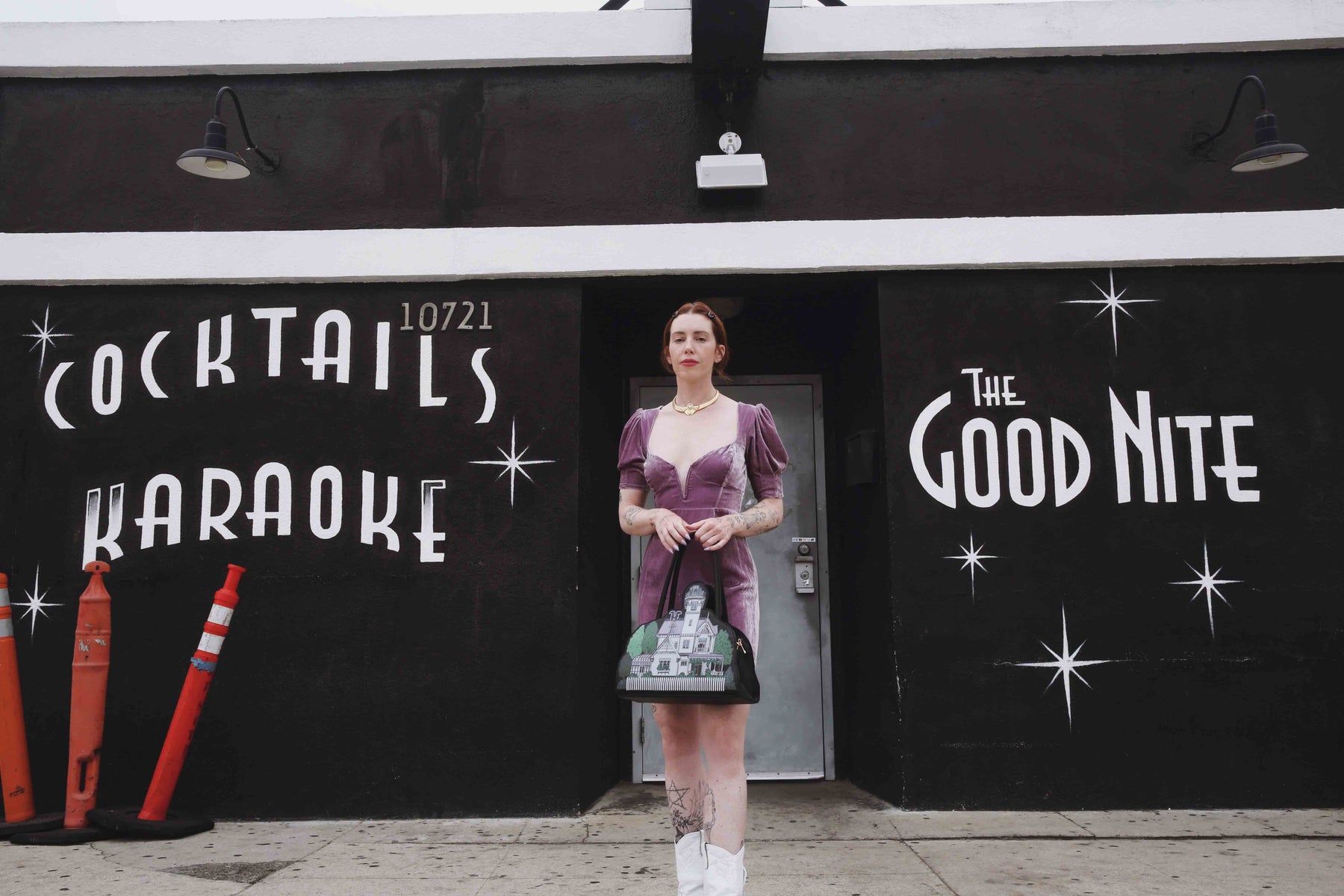 Details include faux leather material, gold metal hardware, bottom feet, removable crossbody strap, dual sided print. She also features a custom purple lining by artist Jillian Thalman!